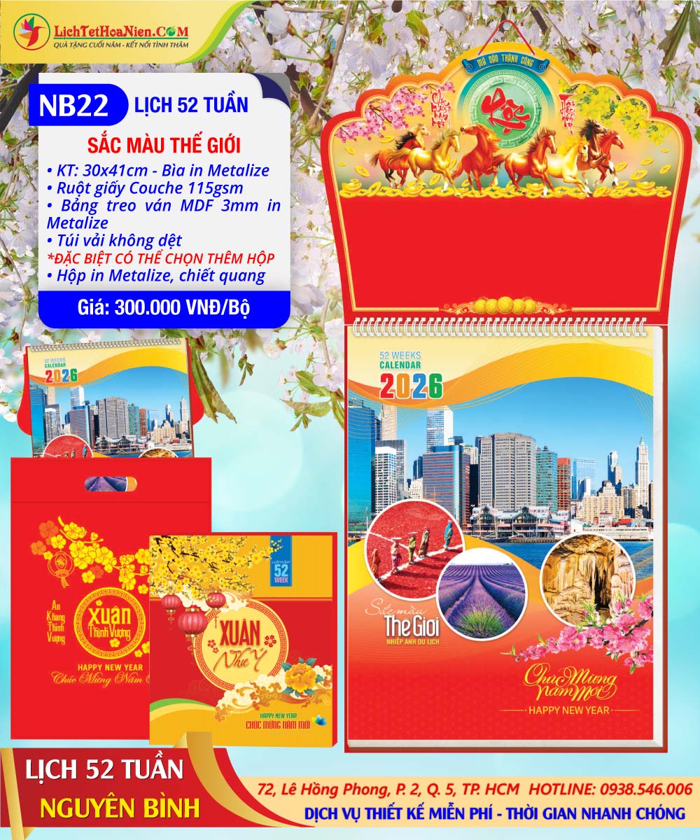 Lịch 52 Tuần Nguyên Bình 2026 ( trọn bộ) giá: 140.000 đồng. Bán sỉ và lẻ tại Đc: 72 Lê Hồng Phong, P.2, Q.5. Lịch 52 Tuần 2026 giá rẻ là một sản phẩm lịch truyền thống mang đậm nét văn hóa Việt Nam, được thiết kế tinh tế, kết hợp giữa nét đẹp cổ điển và tính thực tiễn hiện đại. Đối với nhiều gia đình Việt Nam, lịch 52 tuần không chỉ là công cụ quản lý thời gian mà còn là vật trang trí đẹp mắt và ý nghĩa trong ngôi nhà.